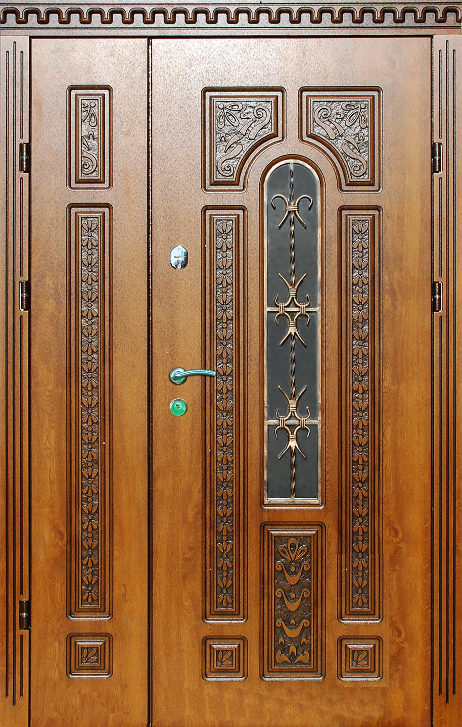 Поскольку в большинстве случаев устанавливаемые на входе в коттедж двустворчатые двери являются еще и предметом интерьера, украшающим здание, их дизайну предается особое значение. Эти двери, как правило, отделываются атмосферостойким МДФ, натуральным шпоном, массивом. Эффектно на таких дверях смотрится витражный узор, применение ковки, зеркальных элементов. Вариантов декора входной двустворчатой двери масса, тут все зависит от пожеланий заказчика.