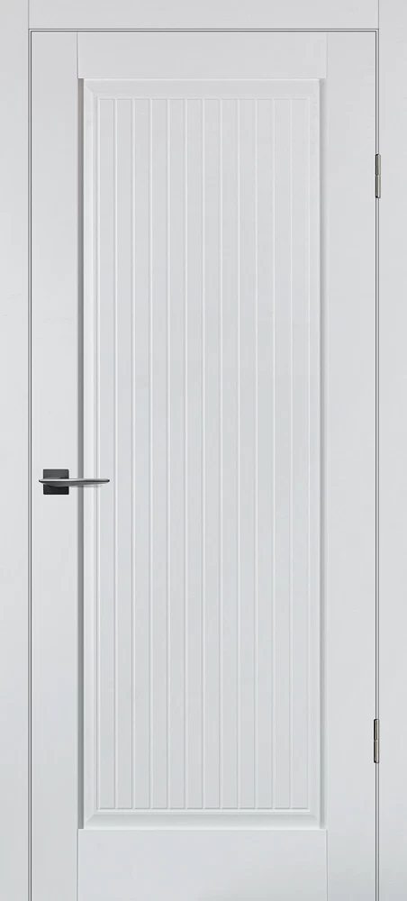 Царговое полотно, выполненное в гладком матовом покрытии, приятным на ощупь, обладающее высокими эксплуатационными характеристиками. Бескромочная технология. Полотно комплектуется объемной филенкой с фрезерованным рисунком "под рейку". В остекленных полотнах используется рифленное стекло с красивым прокатным узором в виде полос. Отлично смотрится в неоклассических и лофтовых интерьерах.