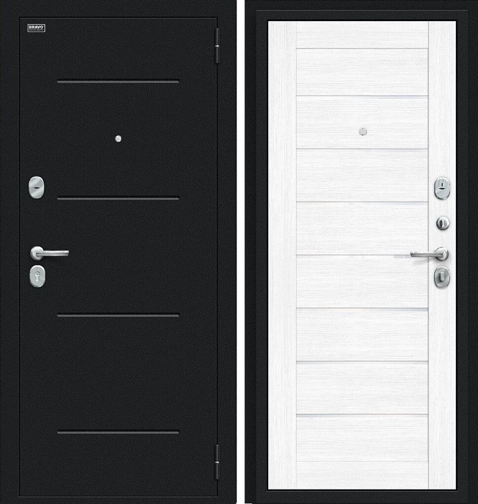 Надежная входная Дверь Браво Техно Букле черное/Snow Melinga премиум класса по цене 30 857 руб. Большая толщина стали защитит от проникновения в ваш дом, квартиру или коттедж. Используется очень качественная фурнитура: замки, цилиндры, ручки, защелки. Покрытие и отделка двери изготовлено под внимательным контролем производителя. Дверь имеет долгий срок службы и гарантию.